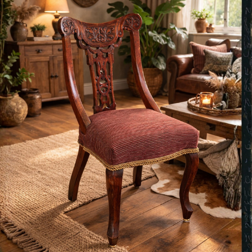 Zoekwoorden: country stoel, western stoel, antieke stoel, houten stoel landelijk, gestoffeerde stoel, stoel met sierbies, vintage stoel, country western interieur